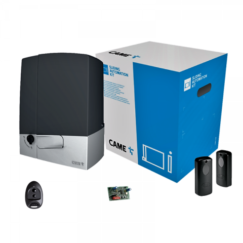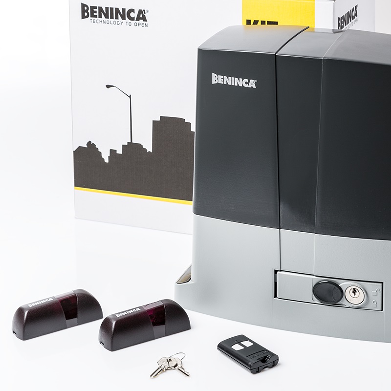 Szybki napęd 24 V do bram przesuwnych do 400 kg. Gotowy zestaw z 2 pilotami Maxi 2, fotokomórkami VISIO i lampą SUNLED.