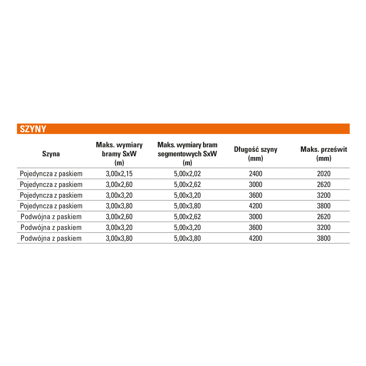 – WAŻNE: Maksymalny wymiar drzwi dla zastosowania napędu D1000, podany jest w galerii zdjęć w tabeli pt. SZYNY