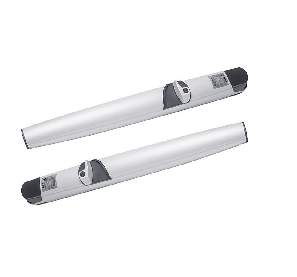 Dwa elektromechaniczne siłowniki SURF 350 BR 36 mają wytrzymałą konstrukcję. Ich obudowy wykonano z odlewanego ciśnieniowo aluminium i pokryto trwałym lakierem poliestrowym, co zwiększa odporność na warunki zewnętrzne. Zmniejszona szerokość ułatwia montaż w ograniczonych przestrzeniach. Najważniejsze cechy tej części zestawu to: droga radiowa 433 MHz, ślimak z łożyskami zapewniający maksymalną wytrzymałość, regulowane złącze tylne z otworami oraz ręczny metalowy system zwalniający.