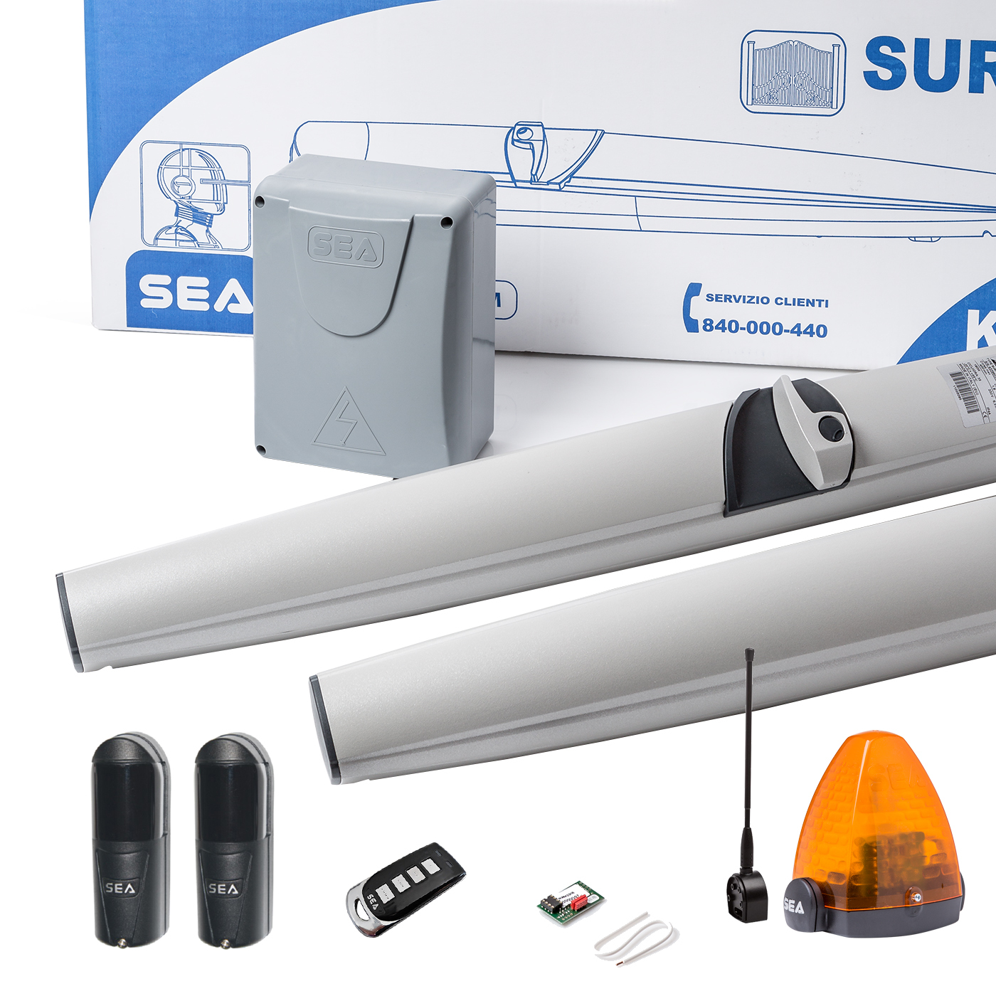 centrala sterująca, siłowniki SURF 350 H BR – 2 szt., fotokomórki Flips Sea – 2 szt., antena 433 MHz, lampa LED, czarny pilot Eagle, odbiornik 433 MHz oraz mechaniczne wyłączniki krańcowe – prawy i lewy.