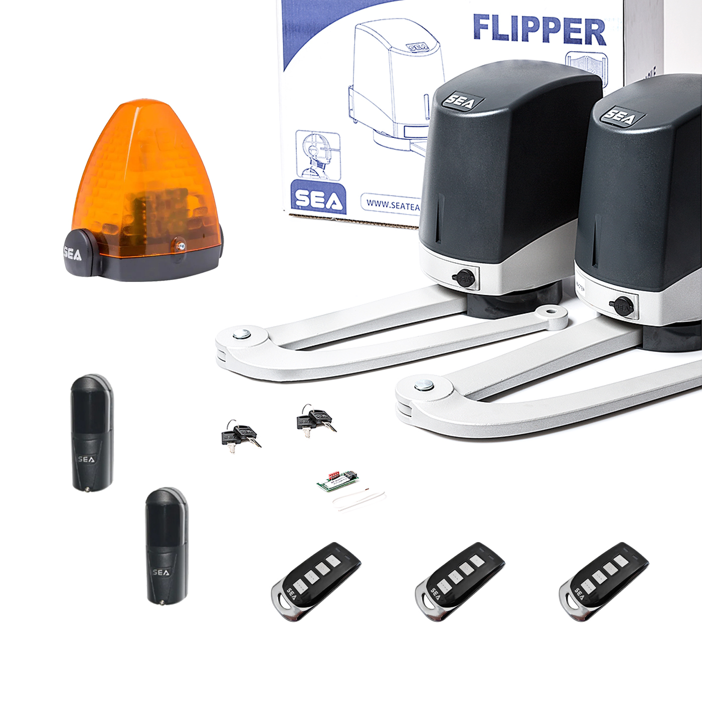 Zestaw SEA FLIPPER do bram skrzydłowych o maksymalnej długości skrzydła 2 m z lampą sygnalizacyjną 24V LED i trzema pilotami Eagle