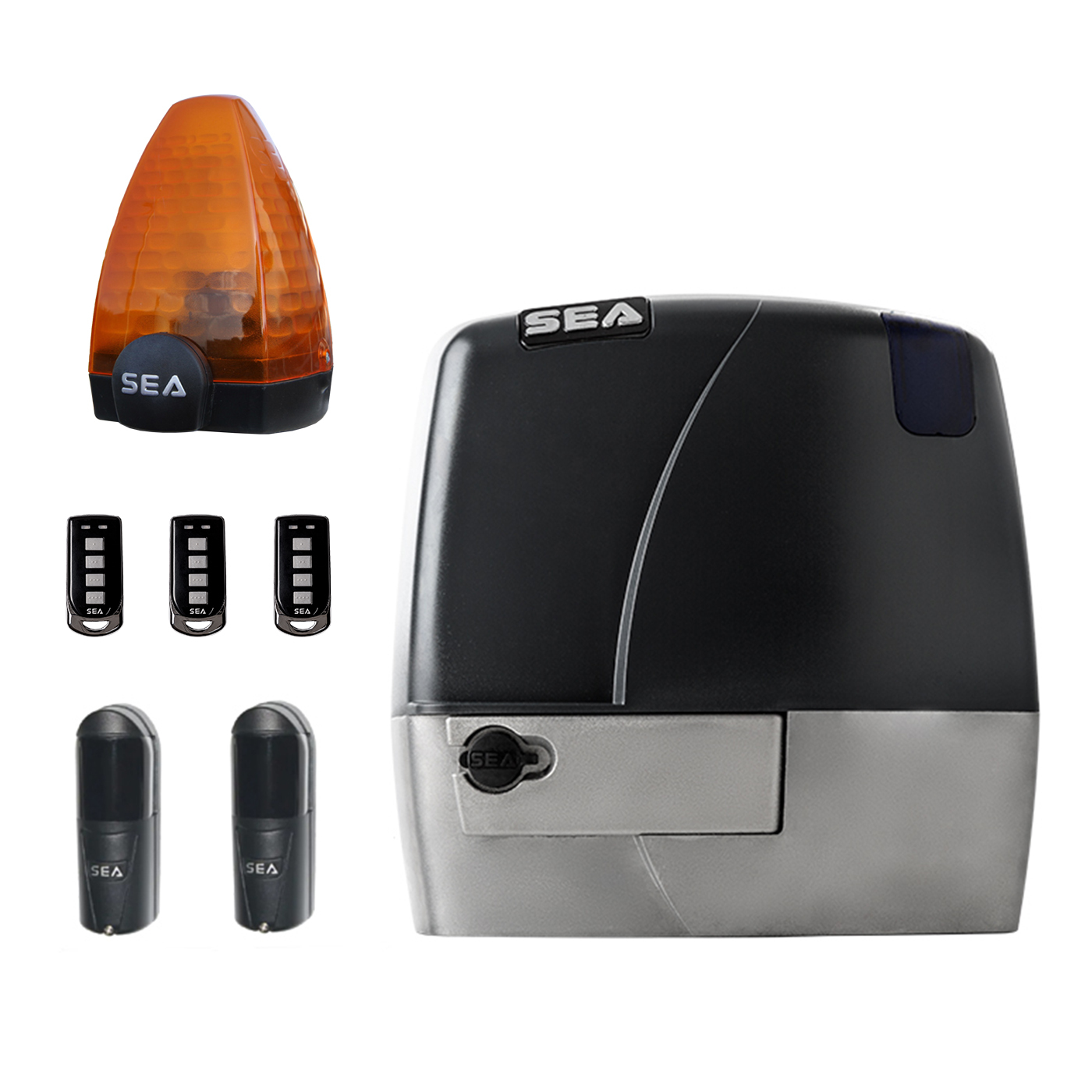 Najważniejsze cechy zestawu to uniwersalny siłownik do bram przesuwnych, para regulowanych przewodowych fotokomórek FLIPS SEA, ciśnieniowo odlewany korpus aluminiowy, sprzęgło elektroniczne zabezpieczające przed zgnieceniem, regulowane spowolnienie podczas otwierania i zamykania, mechaniczny wyłącznik krańcowy, możliwość wprowadzenia oświetlenia ledowego, zwalnianie za pomocą dźwigni oraz droga radiowa 433 MHz.